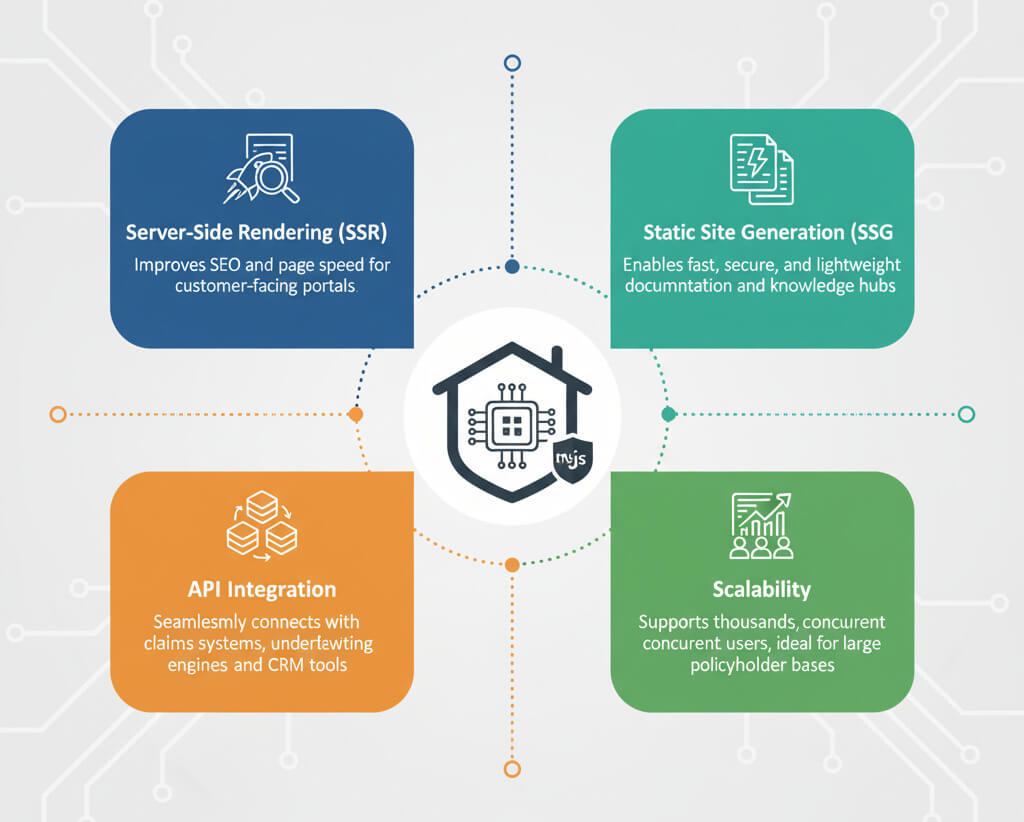 Next.js brings speed, flexibility, and scalability to insurance platforms, making it a top choice for modern builds: