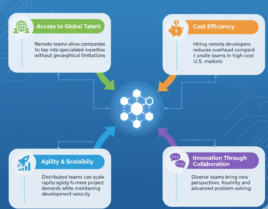 - Agility & Scalability: Distributed teams can scale rapidly to meet project demands while maintaining development velocity.