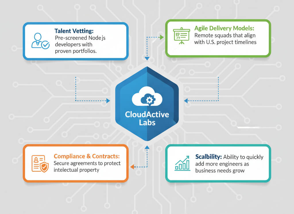 Looking to hire reliable full-stack Node.js developers remotely? CloudActive Labs provides vetted talent, agile frameworks, and U.S.-aligned delivery models so you can innovate without borders.