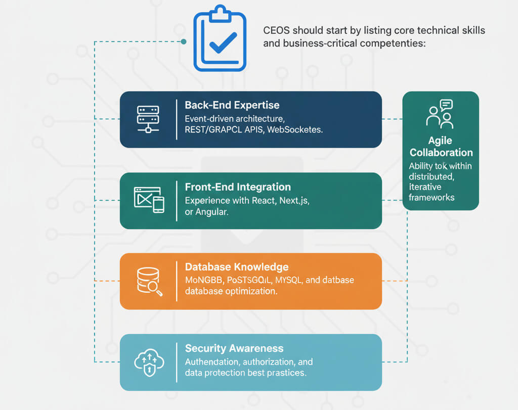 Not all Node.js developers are created equal. CEOs should start by listing core technical skills and business-critical competencies: