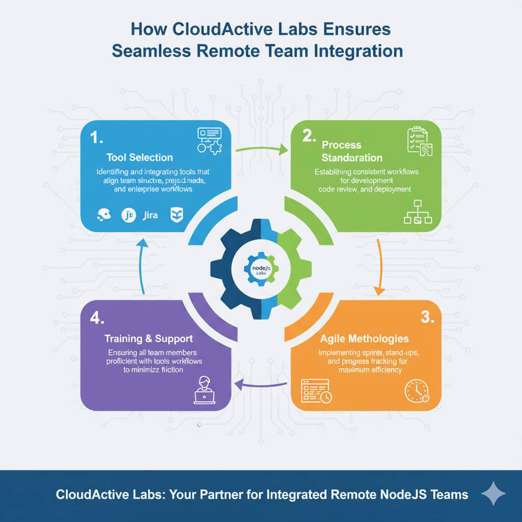 CloudActive Labs helps organizations implement dedicated remote Node.js teams with the right ecosystem of tools, ensuring smooth workflows and consistent outcomes.