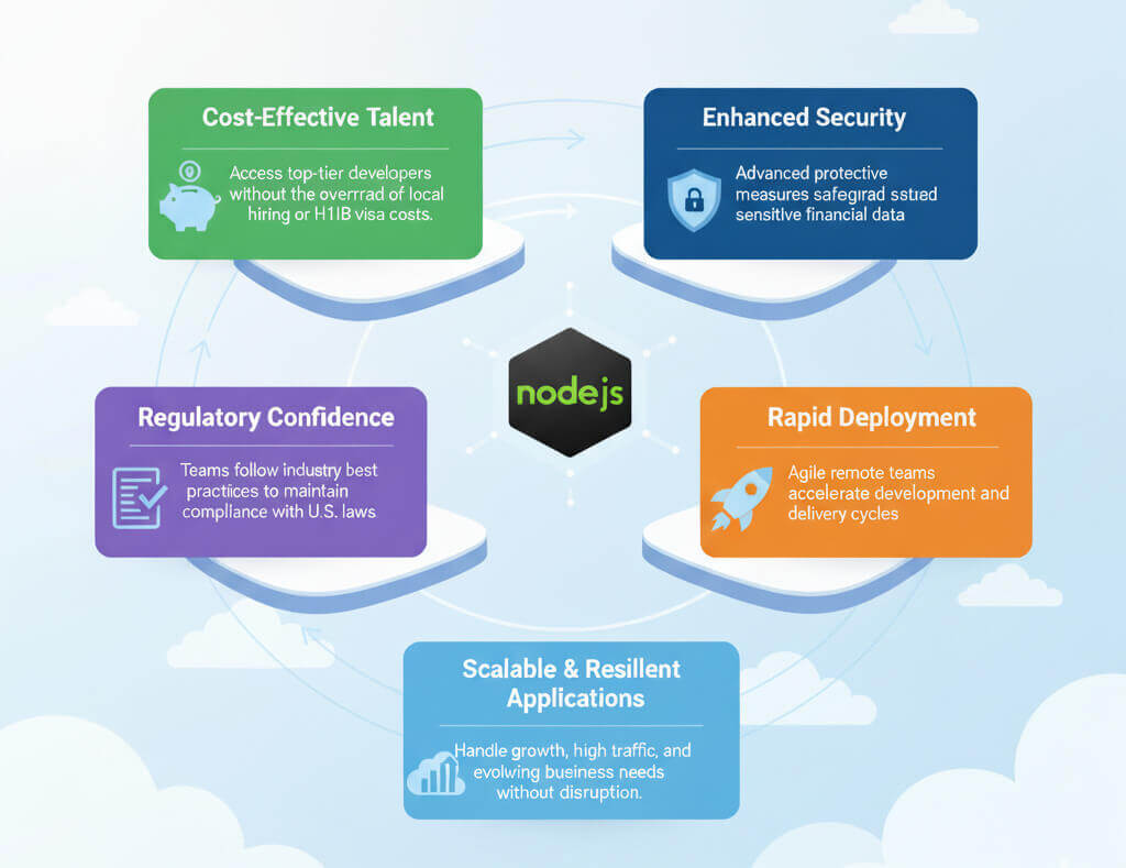 In the U.S. fintech sector, regulatory compliance, security, and scalability are not optional—they are mission-critical. Partnering with remote Node.js experts allow businesses to build resilient, compliant, and high-performing platforms while optimizing costs and maintaining operational efficiency.