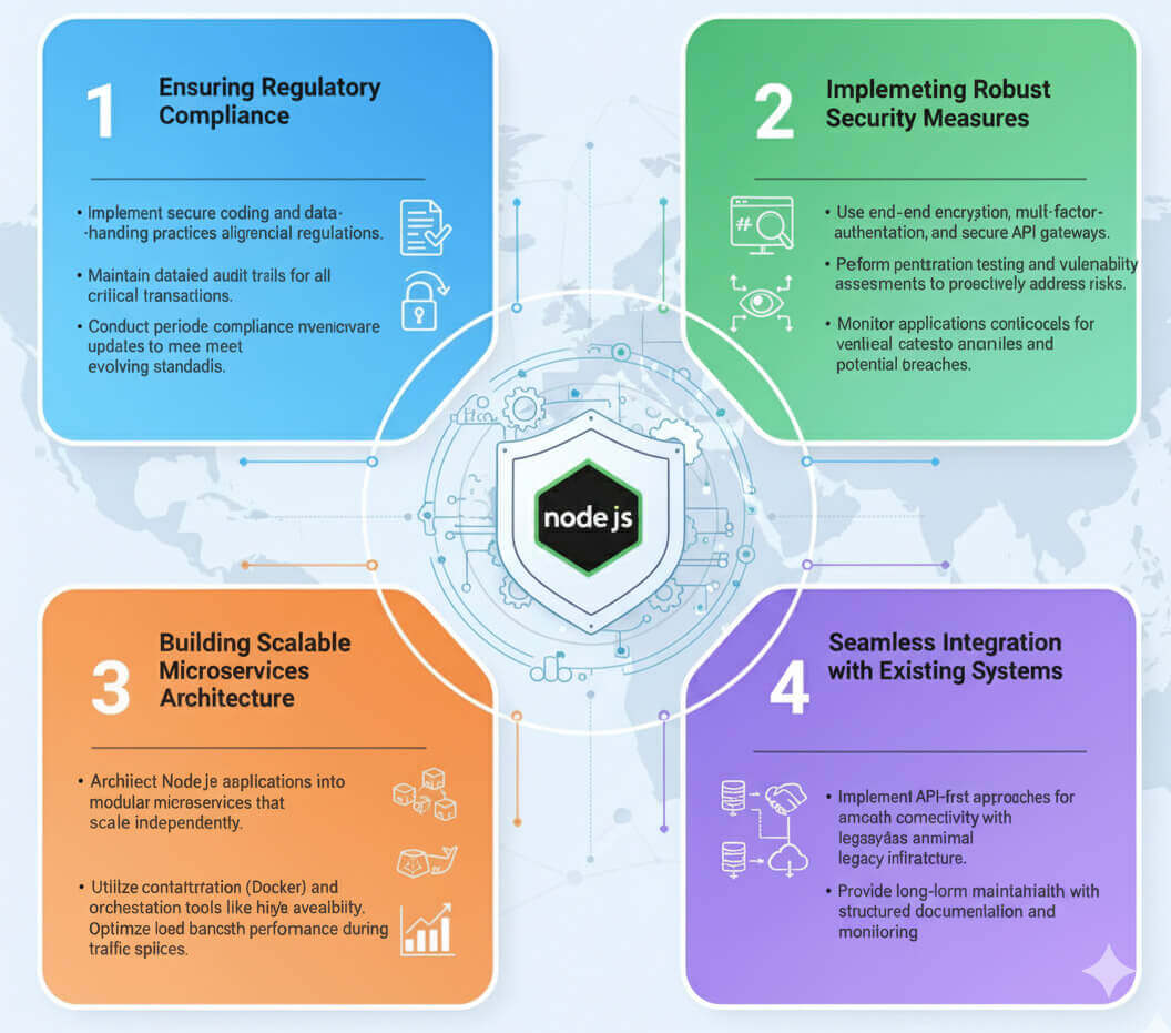 Many U.S. financial institutions operate on legacy infrastructures that must work seamlessly with modern Node.js applications. Integration challenges include data consistency, system reliability, and minimal disruption during migrations.