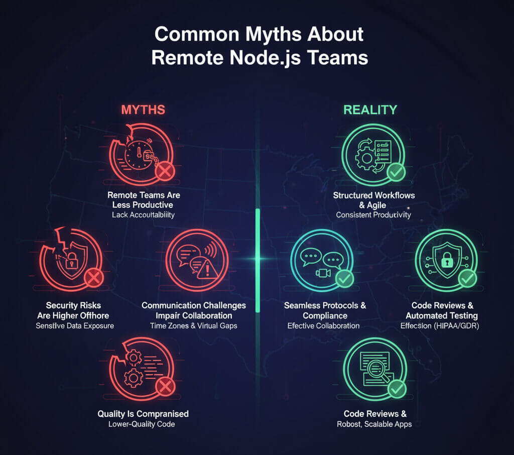 हाल के वर्षों में, दूरस्थ विकास टीमें अमेरिकी तकनीकी परिदृश्य का एक अभिन्न अंग बन गई हैं। फिर भी, कई संगठन अभी भी विदेशी Node.js डेवलपर्स को आउटसोर्स करते समय उत्पादकता, सुरक्षा और विश्वसनीयता को लेकर गलत धारणाएँ रखते हैं। CloudActive Labs इन भ्रांतियों का समाधान करते हुए यह दर्शाता है कि दूरस्थ Node.js टीमें अमेरिकी व्यवसायों के लिए लचीलापन और लागत-प्रभावशीलता प्रदान करते हुए उच्च-गुणवत्ता, सुरक्षित और कुशल समाधान प्रदान कर सकती हैं।