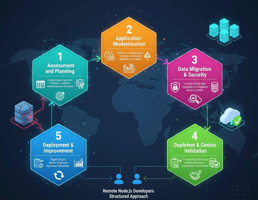 दूरस्थ Node.js डेवलपर सफल माइग्रेशन परियोजनाओं को सुनिश्चित करने के लिए एक संरचित दृष्टिकोण का पालन करते हैं: