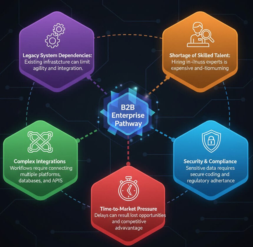 जटिल एकीकरण: B2B वर्कफ़्लो में अक्सर कई प्लेटफ़ॉर्म, डेटाबेस और API को जोड़ने की आवश्यकता होती है।