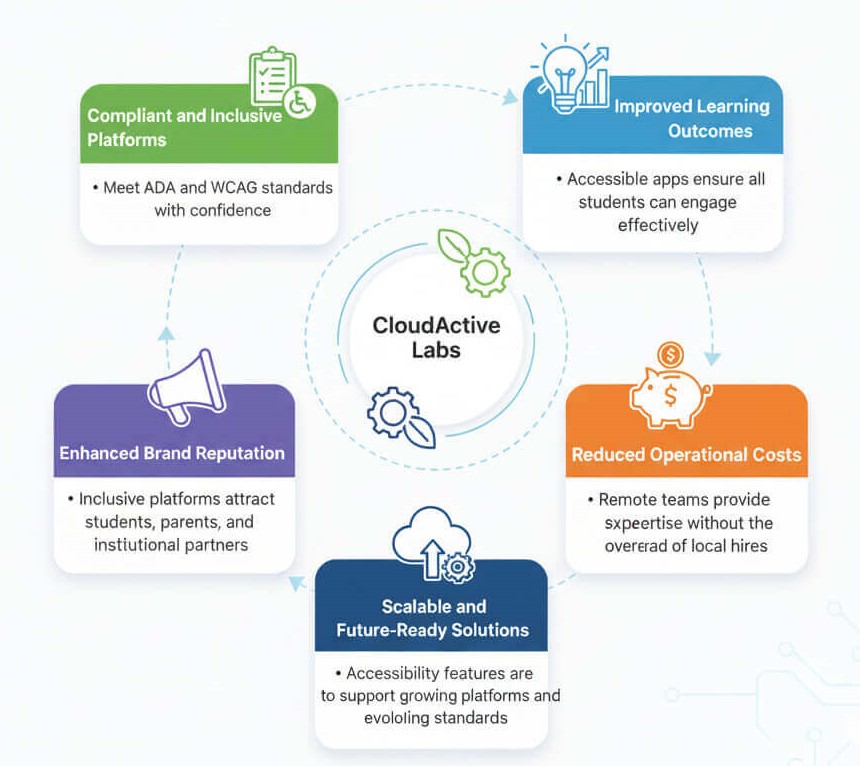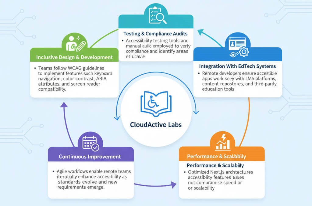 आधुनिक अमेरिकी एडटेक प्लेटफ़ॉर्म के लिए वेब एक्सेसिबिलिटी ज़रूरी है। क्लाउडएक्टिव लैब्स की दूरस्थ नेक्स्ट.जेएस डेवलपमेंट टीमों का लाभ उठाकर, संस्थान यह सुनिश्चित कर सकते हैं कि उनके एप्लिकेशन समावेशी, अनुपालन योग्य और उच्च प्रदर्शन वाले हों, और सभी छात्रों को समान अवसर प्रदान करें।