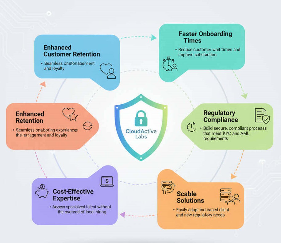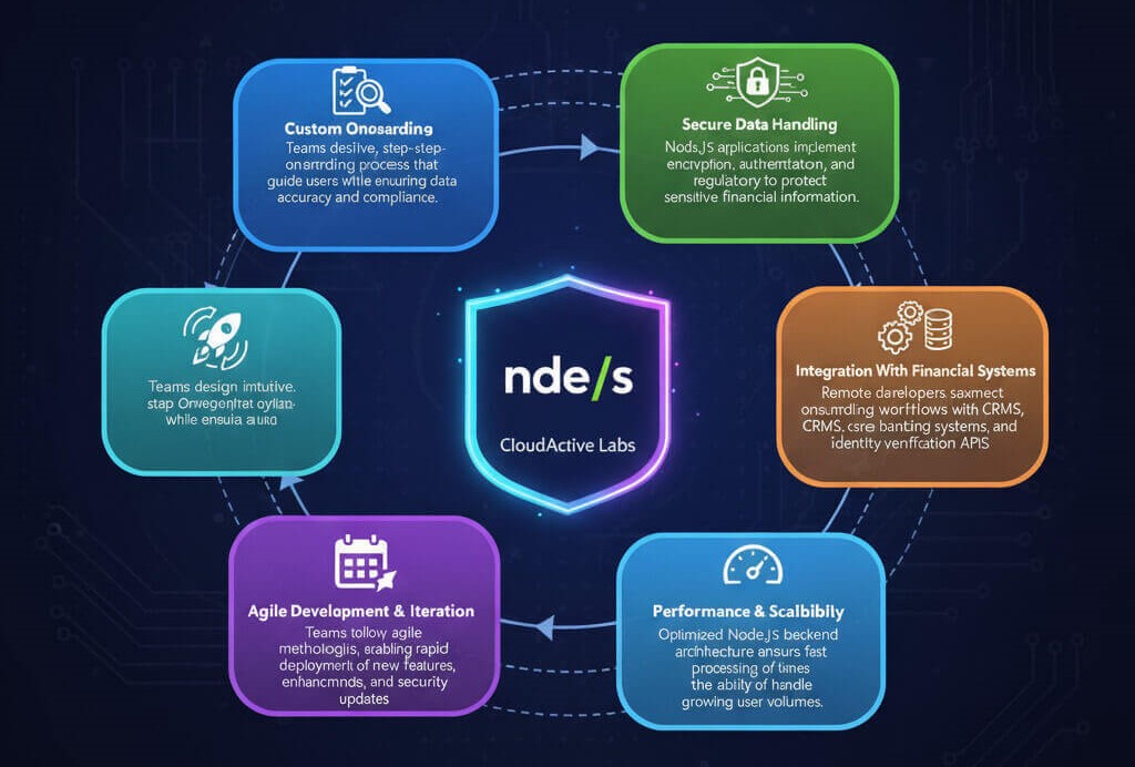 क्लाउडएक्टिव लैब्स, दूरस्थ Node.js विकास टीमों का लाभ उठाकर वित्तीय संस्थानों को ऑनबोर्डिंग प्रक्रियाओं को आधुनिक बनाने में मदद करती है ताकि वे डिजिटल, अनुपालन योग्य और उपयोगकर्ता-अनुकूल समाधान तैयार कर सकें जो नियामक मानकों को बनाए रखते हुए ग्राहक अधिग्रहण को सुव्यवस्थित करते हैं।