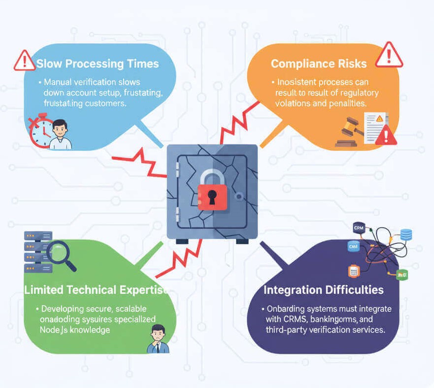 - सीमित तकनीकी विशेषज्ञता: सुरक्षित, स्केलेबल ऑनबोर्डिंग सिस्टम विकसित करने के लिए विशेष Node.js ज्ञान की आवश्यकता होती है।