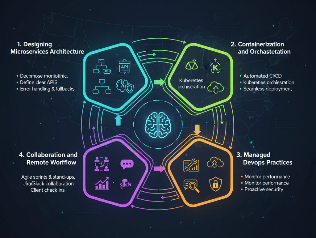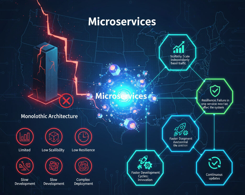 आधुनिक अमेरिकी व्यवसायों को आज की तेज़-तर्रार डिजिटल अर्थव्यवस्था में प्रतिस्पर्धी बने रहने के लिए लचीले, मापनीय और विश्वसनीय अनुप्रयोगों की आवश्यकता होती है। इसे प्राप्त करने के सबसे प्रभावी तरीकों में से एक माइक्रोसर्विस आर्किटेक्चर है, जो मोनोलिथिक अनुप्रयोगों को छोटी, स्वतंत्र सेवाओं में विभाजित करता है जिन्हें कुशलतापूर्वक स्केल, अपडेट और तैनात किया जा सकता है। क्लाउडएक्टिव लैब्स अमेरिकी कंपनियों को तकनीकी विशेषज्ञता, प्रबंधित DevOps प्रथाओं और एंटरप्राइज़-ग्रेड अनुप्रयोगों के लिए क्लाउड-तैयार बुनियादी ढाँचे को मिलाकर, लचीली माइक्रोसर्विसेस बनाने के लिए ऑफशोर Node.js डेवलपर्स का लाभ उठाने में मदद करता है।